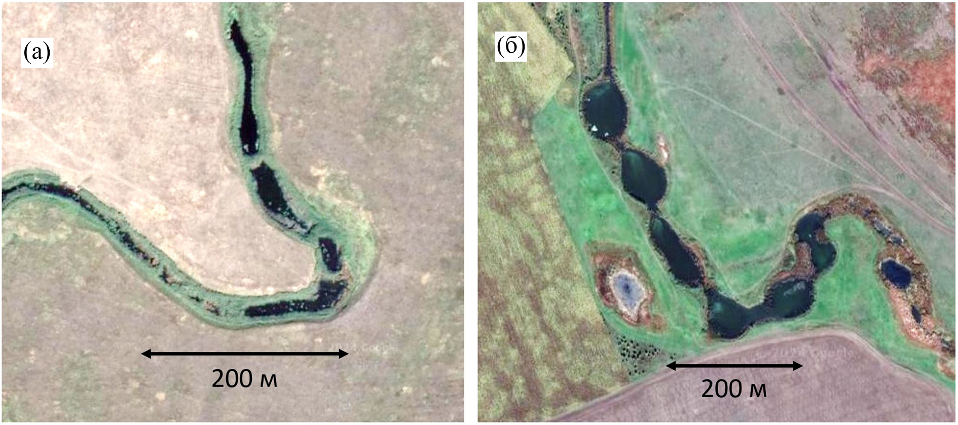 Рис. 7. Примеры чётковидных русел, относящихся к различным группам: (a) – первая группа; (б) – вторая группа.