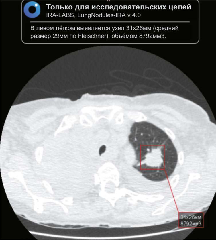 Заключение. Использование искусственного интеллекта для анализа результатов компьютерной томографии органов грудной клетки демонстрирует высокую эффективность в отношении выявления узловых образований лёгких, в том числе на фоне COVID-19, что подтверждает перспективы его применения для раннего обнаружения случайных лёгочных узлов, которые могли бы быть пропущены.