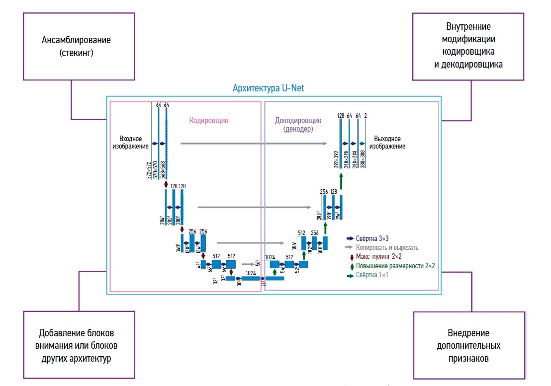 Методы обработки данных с использованием нейронных сетей завоёвывают всё большую популярность в области медицинской диагностики. Наиболее часто их применяют при исследовании медицинских изображений органов человека с использованием компьютерной и магнитно-резонансной томографии, ультразвуковых и иных средств неинвазивных исследований. Диагностирование патологии в таком случае сводится к решению задачи сегментации медицинского изображения, то есть поиска групп (областей) пикселов, характеризующих некоторые объекты на снимке. Один из наиболее успешных методов решения данной задачи — разработанная в 2015 году нейросетевая архитектура U-Net. В настоящем обзоре авторы проанализировали разнообразные модификации классической архитектуры U-Net. Рассмотренные работы разделены на несколько ключевых направлений: модификации кодировщика и декодировщика; использование блоков внимания; комбинирование с элементами других архитектур; методы внедрения дополнительных признаков; трансферное обучение и подходы для обработки малых наборов реальных данных. Изучены различные обучающие наборы, для которых приведены лучшие достигнутые в литературе значения метрик (показатель сходства Dice; пересечение над объединением Intersection over Union; общая точность и др.). Также создана сводная таблица с указанием типов анализируемых изображений и выявляемых патологий на них. Обозначены перспективные направления дальнейших модификаций для повышения качества решения задач сегментации. Результаты могут быть полезны в области выявления заболеваний, прежде всего, онкологических. Представленные алгоритмы могут стать частью профессиональных медицинских интеллектуальных ассистентов.