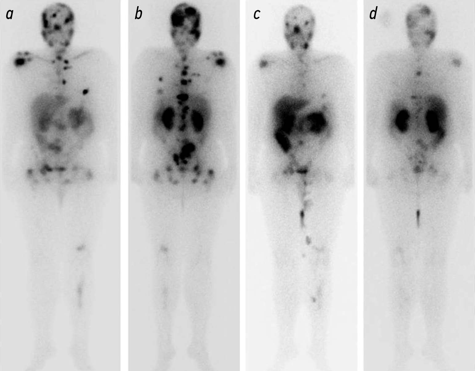 Метастатический кастрационно-резистентный рак предстательной железы (мКРРПЖ) — это прогрессирование опухолевого процесса при формировании невосприимчивости к андроген-депривационной терапии. Частота появления метастазов в костях у таких пациентов достигает 90%. В диагностике мКРРПЖ широко используют лучевые методы исследований. Компьютерная томография и магнитно-резонансная томография обладают преимуществами в анатомической визуализации, однако имеют ограничения в оценке эффективности лечения заболевания. Сцинтиграфию применяют для скрининга метастатического поражения костей скелета, но при этом затруднён анализ прогрессирования заболевания. Позитронно-эмиссионную томографию (ПЭТ), совмещённую с компьютерной томографией, и однофотонную эмиссионную компьютерную томографию используют для раннего выявления местного или системного распространения рака предстательной железы. Информация о количестве поглощённого радиофармпрепарата (РФП) с помощью ПЭТ-визуализации простатоспецифичного мембранного антигена используют для прогнозирования эффективности противоопухолевой терапии. С внедрением в практическую деятельность РФП (177Lu-PSMA) открылась перспектива проведения радионуклидной терапии с одновременным определением её эффективности методами гибридной визуализации. Возможности методов лучевой диагностики метастазов в кости представляют особый интерес для изучения и систематизации получаемых данных и разработки показаний для проведения радиолигандной терапии и анализа её эффективности.