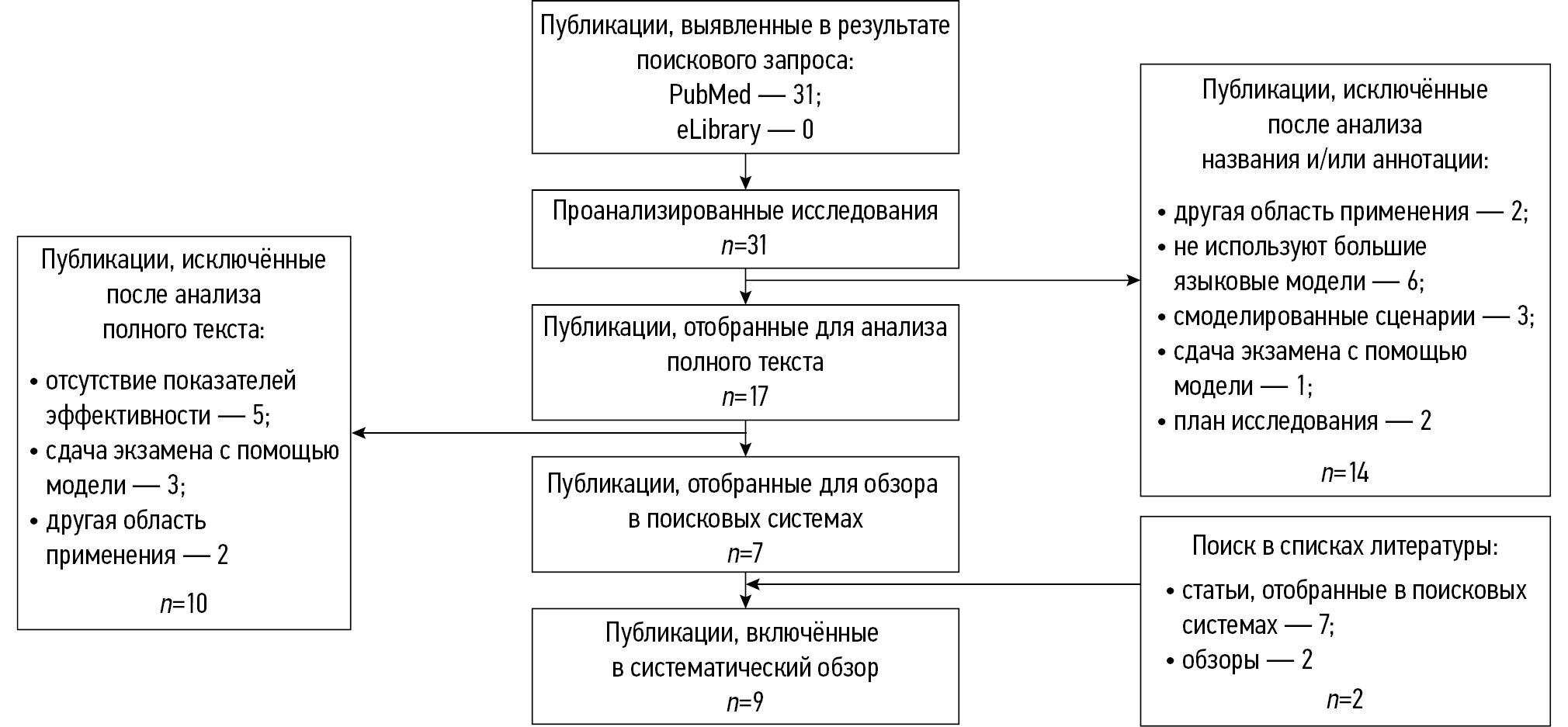 METHODS: Two search strategies were employed: a primary search (PubMed and eLibrary) targeting full-text publications with well-developed methodology, and a supplementary search (PubMed) aimed at broader coverage of large language model use cases in radiological diagnostics during 2023–2025. Extracted data included bibliometric characteristics, study objectives, use-case scenarios of large language models, nosological profiles, key methodological parameters, and both quantitative and qualitative indicators of diagnostic performance—for both the models and the specialists involved, including their number and experience. The quality was assessed using the modified QUADAS-CAD questionnaire.