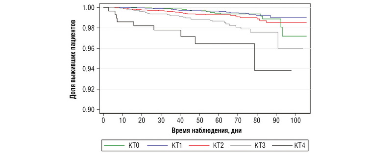 RESULTS: The total sample volume was 38,051 patients. In this study, the risk of death was three times higher for CT-4 than for CT-0. In the Kaplan–Meier survival curve, the survival rate of patients in the CT-3 category was almost three times lower (hazard ratio = 2.94) than in the CT 0–2 categories; in addition, the higher the initial category of CT, the lower the risk of deterioration. The time for hospitalization decreased with the increase in the CT grade.