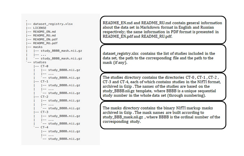 With the ongoing COVID-19 pandemic decreasing availability of polymerase chain reaction with reverse transcription and the snowballing growth of medical imaging, especially the number of chest computed tomography (CT) scans being performed, methods to augment and automate the image analysis, increasing productivity and minimizing human error are of particular importance. The creation of high-quality datasets is essential for the development and validation of artificial intelligence algorithms. Such technologies have sufficient accuracy in diagnosing COVID-19 in medical imaging. The presented large-scale dataset contains anonymized human CT scans with COVID-19 features as well as normal studies. Some studies were tagged by radiologists using binary pixel masks of regions of interest (e.g., characteristic areas of consolidation and ground-glass opacities). CT data were acquired between March 1, 2020, and April 25, 2020, and provided by municipal hospitals in Moscow, Russia. The presented dataset is licensed under Creative Commons Attribution-NonCommercial-NoDerivs 3.0 Unported (CC BY-NC-ND 3.0).