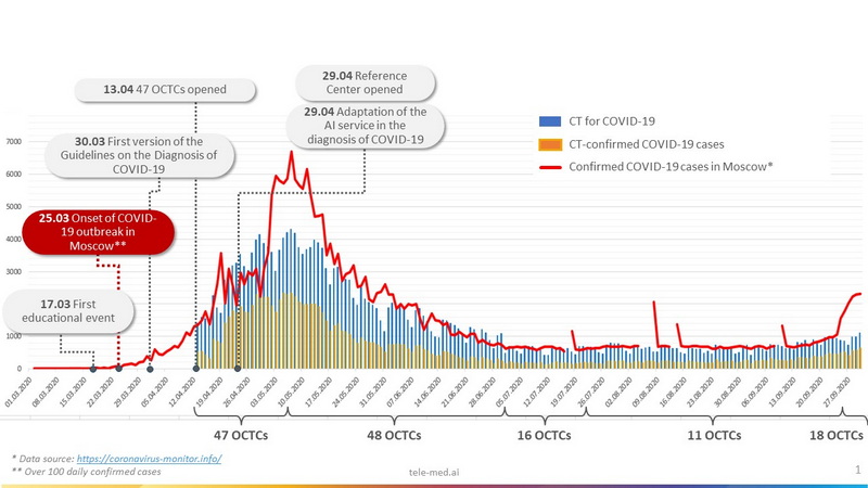 At the beginning of the first wave of the COVID-19 pandemic, a network of outpatient CT centers (OCTC) for lung pathology diagnostics in patients with suspected viral pneumonia with the round-the-clock operation was formed in Moscow. The introduction of the “CT 0-4” scale allowed for effective routing. To prevent the spread of infection among patients and staff, OCTC zoning was introduced, dividing into “red,” “buffer,” and “green” zones. As part of the mobilization of the Radiology Service, the Moscow Reference Center was established, aimed at quality control, remote expert consultations, and organizational and methodological support. Several online courses and training webinars have been developed. Artificial Intelligence services were connected to recognize the signs of COVID-19 and assess the severity.