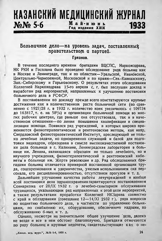 В течение последнего времени бригадами ВЦСПС, Наркомздрава, НК РКИ и Госплана было проведено обследование ряда больниц как в Москве и Ленинграде, так и по областям—Уральской, Ивановской, Центрально-Черноземной, Московской и по краям—Сев.-Кавказскому, Зап.Сибирскому и Горьковскому. О результатах этого обследования Коллегией Наркомздрава 15-го апреля с. г. был заслушан доклад и выработан ряд мероприятий, направленных к улучшению постановки больничного дела в РСФСР.