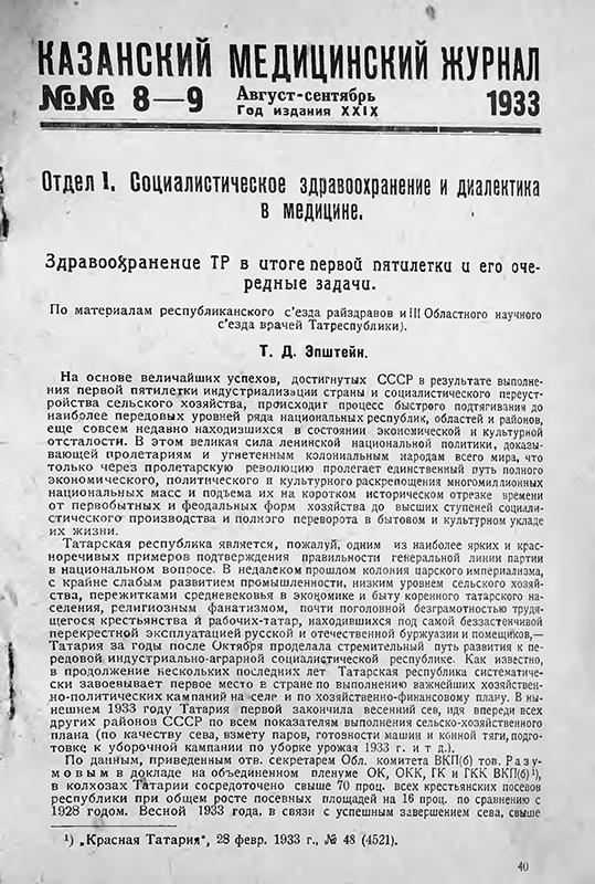 Здравоохранение ТР в итоге первой пятилетки и его очередные задачи