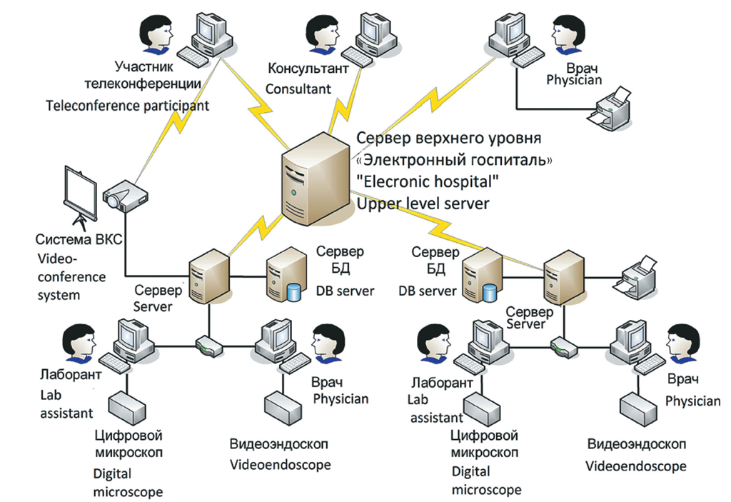 One possible option for the structure of network application of digital diagnostic complexes is presented in Figure 1. The diagram (in the lower part of the figure) shows, as an example, two complexes located in a medical diagnostic facility and connected by a local network to a top-level server of the “electronic hospital” type. Each complex includes three functionally related systems.