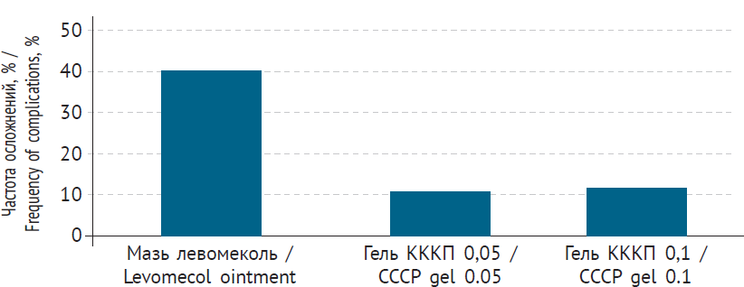 Контаминация ожогов широким спектром патогенных микроорганизмов детерминирует высокую частоту их нагноения (рис. 2). В ходе исследования установлено, что при использовании геля КККПТМ в различных концентрациях осложненное течение раневого процесса отмечено лишь в двух наблюдениях (не более 10 %). При применении мази левомеколь развитие гнойного воспаления в дермальных ранах отмечено почти в 40 % случаев.