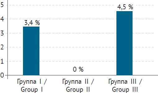 Недостаточность кардии / Insufficiency of cardia | 1 1,7 % | 4 8,2 % | 7 10,1 % | p1,2 = 0,177 p1,3 = 0,070 p2,3 = 1,000 |