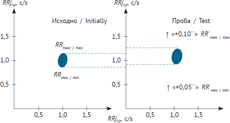 Наглядный пример вегетативного обеспечения сердечной деятельности с дезадаптацией за счет низкой реактивности обоих отделов ВНС представлен на рис. 4. Из рисунка видно, что исходно по КРГ определяется ваготонический тип вегетативной регуляции (RRср = 1,1 с). При дыхательной пробе отмечается недостаточная реакция парасимпатического отдела ВНС, поскольку исходно значение интервала RRмакс = 1,16 с, при дыхательной пробе интервал RR’макс = 1,2 с, то есть произошло увеличение RR’макс только на 0,04 с (при норме 0,05–0,10 с). Это отражает недостаточную реактивность парасимпатического отдела ВНС на функциональную пробу. Исходно значение интервала RRмин = 0,77 с, а при дыхательной пробе интервал RR’мин = 0,73 с, то есть он уменьшился на 0,04 с (при норме 0,05–0,10 с). Эти изменения свидетельствуют о вегетативной дисфункции с низкой реактивностью симпатического отдела ВНС на функциональную пробу.