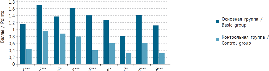 Fig. 3. Results of SCL-90-R: 1 – somatization; 2 – obsessive-compulsive; 3 – sensitivity; 4 – depression; 5 – anxiety; 6 – hostility; 7 – phobic anxiety; 8 – paranoid ideation; 9 – psychoticism; indicator of significance of differences: * (р < 0,05), *** (р < 0,001)