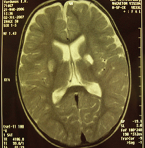 Fig. 1. MRI of a child, 1,9 years old. Diagnosis: Purulent meningitis of hemophilic etiology. Acute ischemic cerebral circulation disorder in the basin of the right middle cerebral artery. T2-VI mode. In the basal structures on the right, a zone of high signal intensity with dimensions of 1.8 × 1.2 × 1.4 cm with fuzzy contours is determined. In the basal regions on the left – a lacunar cyst measuring 1.4 × 0.9 × 1.1 cm / Рис. 1. Магнитно-резонансная томограмма головного мозга ребенка, 1 год 9 мес. Диагноз: «Гнойный менингит гемофильной этиологии. Острое нарушение мозгового кровообращения по ишемическому типу в бассейне правой среднемозговой артерии». Режим Т2-ВИ. В базальных структурах справа определяется зона высокой интенсивности сигнала размерами 1,8 × 1,2 × 1,4 см с нечеткими контурами. В базальных отделах слева — лакунарная киста размерами 1,4 × 0,9 × 1,1 см