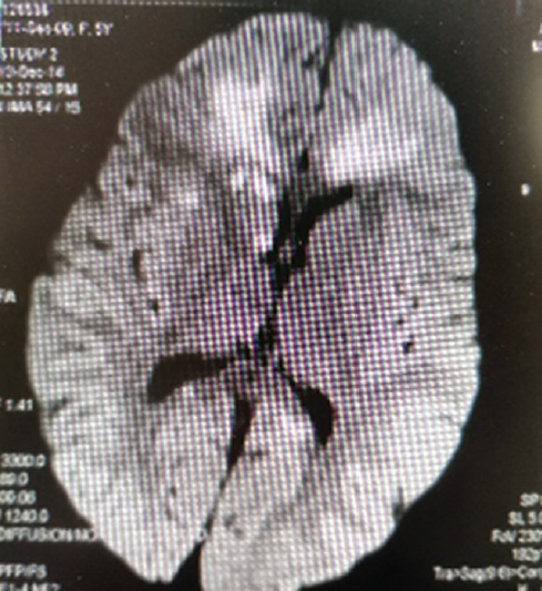 Fig. 2. MRI of a child, 2,4 years old. The DWI shows multiple infarctions of the corpus callosum and the right caudate nucleus / Рис. 2. Магнитно-резонансная томограмма головного мозга ребенка, 2 года 4 мес. На DWI множественные инфаркты мозолистого тела и правого хвостатого ядра