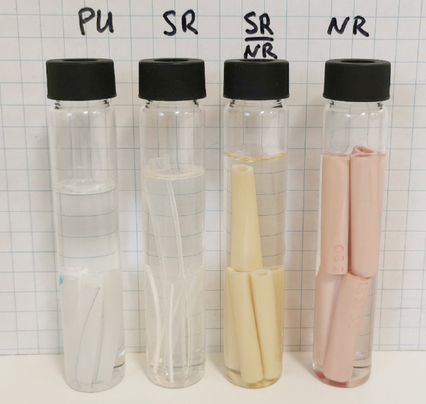 Убыль массы силиконовых и полиуретановых трубок после высушивания пренебрежимо мала, что является свидетельством постоянства их состава, для материалов на основе латекса отмечена потеря примерно 1 % массы, вероятнее всего — за счет экстракции растворимых компонентов латекса.