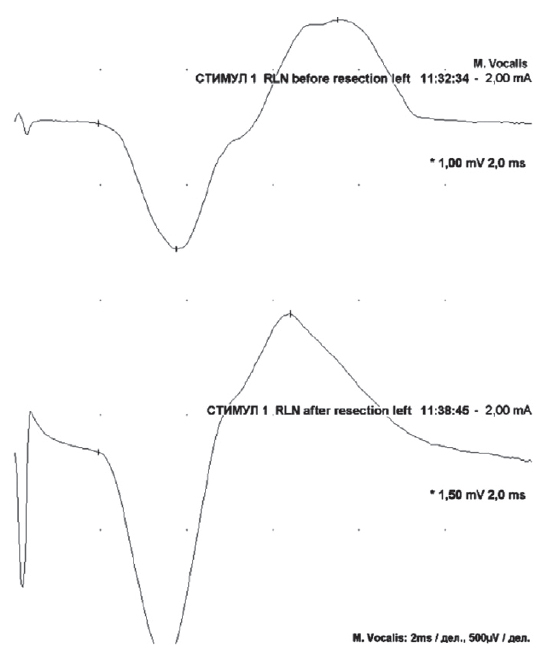 Results. In 52 cases, no decrease in the amplitude of the neuromonitor signal was observed during surgical interventions. In two cases, intraoperatively, a decrease in the signal amplitude associated with excessive traction of the nerve was revealed. Another observation noted the absence of a signal at the end of the operation and the preservation of the mobility of the vocal cords in the postoperative period, probably due to technical errors in performing intraoperative monitoring. In one patient, during the operation, changes in the neuromonitor signal did not occur, but after surgery, a violation of the vocal function was noted, which fully recovered within 3 months. In all likelihood, these changes are due to the technique of tracheal intubation.
