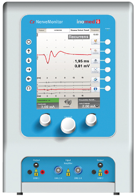 С 2018 г. в 3-м хирургическом отделении СПбГПМУ по приказу Минздрава России выполняется клиническая апробация по внедрению интраоперационного мониторинга ВГН в ходе операций на ЩЖ у детей. Апробацию проводит мультидисциплинарная команда высококвалифицированных специалистов: онколога-хирурга, цитолога, гистолога, лучевого диагноста, ЛОР-врача. Для выполнения интраоперационного мониторинга применяется аппарат C2 Nerve Monitor компании Inomed (рис. 3).