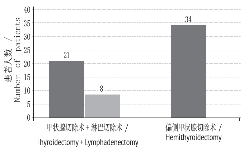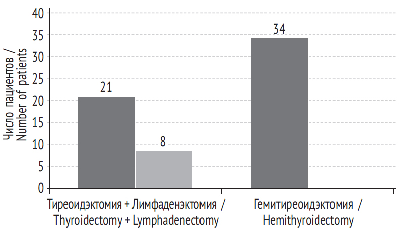 Тиреоидэктомия являлась операцией выбора у 21 (38,1 %) пациента. В остальных 34 (61,9 %) наблюдениях была выполнена гемитиреоидэктомия. У 8 больных папиллярной карциномой ЩЖ тиреоидэктомия дополнена центральной лимфаденэктомией (рис. 7).