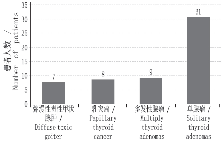 Возраст детей в исследуемой группе составил от 3 до 17 лет, в среднем 15 ± 1,2 года. Мальчиков — 12 (21,8 %), девочек — 43 (78,2 %), соотношение 1 : 5. Папиллярный рак ЩЖ являлся причиной операций у 8 (14,6 %) детей. В 31 (56,3 %) случае хирургические вмешательства выполнены по поводу одиночных аденом. Множественные аденомы выявлены в 9 (16,4 %) наблюдениях. У 7 (12,7 %) детей хирургическое лечение выполнено по поводу диффузного токсического зоба (рис. 6).