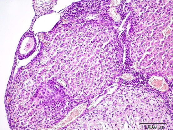 Рис. 2. Микрофотография препарата среза яичника потомства экспериментальной группы Ф-100. Окраска гематоксилином и эозином. Ув. ×100