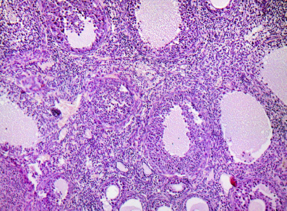 Рис. 1. Микрофотография препарата среза яичника потомства экспериментальной группы С-50. Окраска гематоксилином и эозином. Ув. ×100