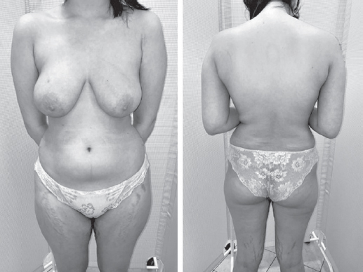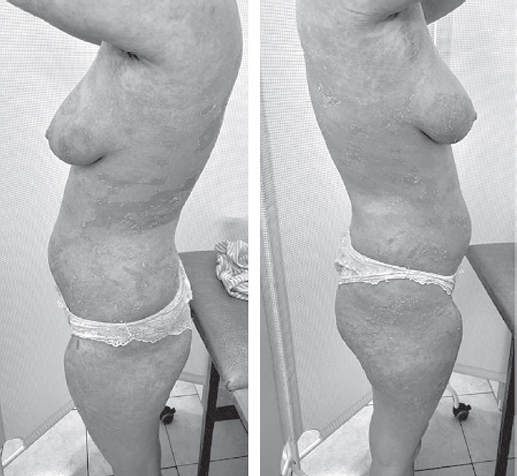 Рис. 3. Клинические фотографии пациентки после начала курса биологической терапии ингибитором интерлейкинов 12, 23 (устекинумаб). Высыпания на коже туловища и конечностей разрешились, PASI 90