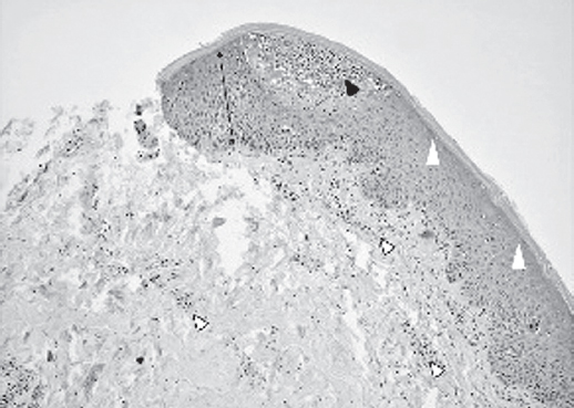 Рис. 2. Микрофотография, окраска гематоксилином и эозином, ×200. В эпидермисе определяется регулярный акантоз (черная двусторонняя стрелка), агранулез (белые треугольники), микроабсцесс Мунро (черная стрелка), в сосочковой и ретикулярной дерме определяется гетерогенный периваскулярный инфильтрат из лимфоцитов, гистиоцитов с примесью нейтрофилов (белые стрелки)