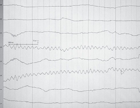 У двух пациентов зарегистрированы иктальные паттерны. Клинически выявлены фокальные моторные приступы, сопровождающиеся региональными изменениями на ЭЭГ (ритмической активностью в диапазоне α-волн в лобно-височной области левого полушария и региональными комплексами «острая – медленная волна» в височных отведениях соответственно). На рис. 2 и 3 представлены паттерны фокальных моторных приступов.