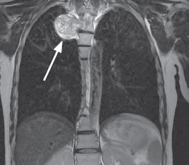Fig. 1. MRI of the thoracic spine, coronal view, the tumor is indicated by an arrow