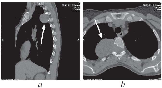 Рис. 3. Многослойная компьютерная томография грудного отдела позвоночника, сагиттальная (а) и аксиальная (b) проекции. Опухоль указана стрелками, визуализируется экскавация заднеправых отделов тела позвонка Тh и правой дуги