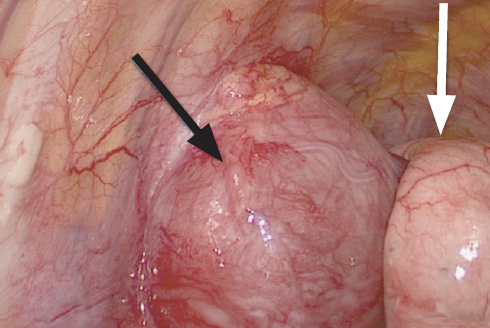 Рис. 5. Интраоперационная фотография: выполнение торакоскопического этапа. Белой стрелкой указано коллабированное легкое, черной — опухоль