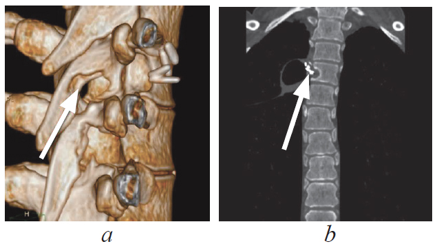 Fig. 7. MSCT of the thoracic spine after surgery. The Th5 arch defect is visualized on the 3D reconstruction (a, arrow), the space at the site of the removed tumor, hemostatic clips (b, arrow)