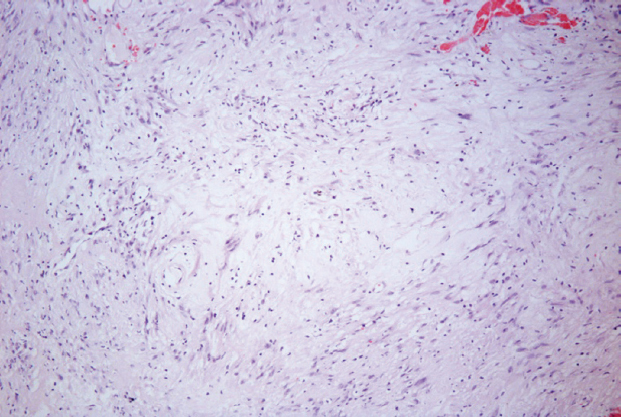 Рис. 8. Гистологическая картина нейрофибромы. На фотографии представлена опухоль периферического нерва из клеток с небольшими овальными ядрами и хорошо различимыми клеточными отростками, продемонстрированы структуры по типу «тертой моркови». Окрашивание гематоксилином и эозином, ×100
