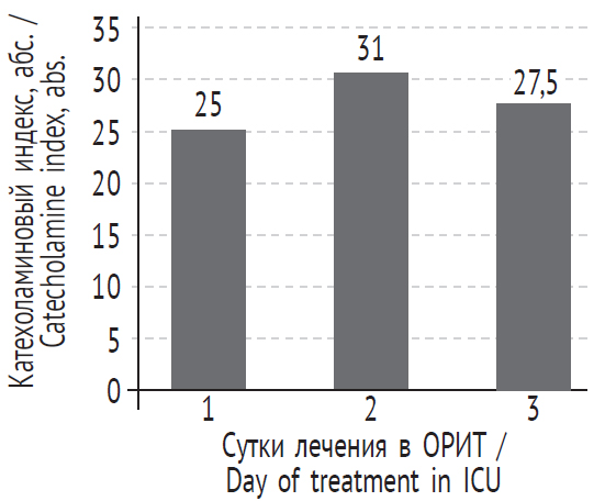 В последующие трое суток лечения отмечена стойкая положительная динамика — регрессирование явлений недостаточности кровообращения и синдрома диссеминированного внутрисосудистого свертывания, нормализация функции почек, в связи с чем принято решение о прекращении сеанса экстракорпоральной гемокоррекции. Динамика катехоламинового индекса на фоне экстракорпоральной гемокорреции представлена на рис. 1.