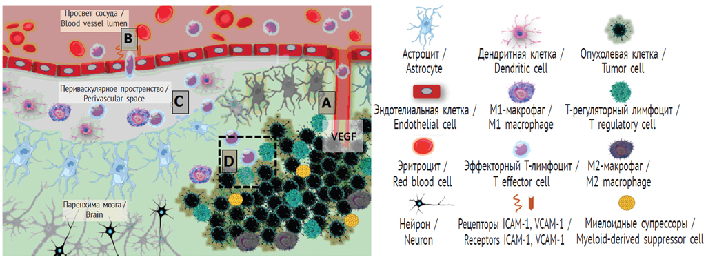 Уникальность иммунной системы головного мозга заключается в первую очередь в наличии ГЭБ. Однако его нельзя расценивать как абсолютно непреодолимое препятствие для Т-лимфоцитов. Более того, как уже упоминалось, глиобластома сама может нарушать целостность ГЭБ: известно, что для глиомы характерен инфильтративный рост, в процессе которого опухолевые клетки разрушают связи нервных структур, что приводит к нарушению внеклеточного метаболизма и разрушению ГЭБ [7]. Кроме этого, повышенная скорость метаболизма глиобластом приводит к локальной гипоксии и усилению синтеза HIF-1 (фактор, индуцируемый гипоксией-1), который стимулирует выработку VEGF (фактор роста эндотелия сосудов) опухолью и клетками микроокружения [4, 7]. Секретируемый таким образом VEGF вызывает разрушение физиологического ГЭБ и рост структурно измененных капилляров из существующих сосудов (рис. 2, A).