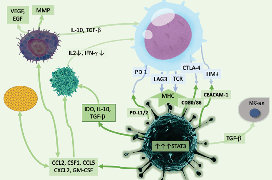 Fig. 3. Immunosuppressive mechanisms of glioblastoma microenvironment. Designation of cells and their components as in Fig. 2. VEGF — vascular endothelium growth factor; ММР — metalproteinase; EGF — epidermal growth factor; IL — interleukin; TGF-β — transforming growth factor β; IFN-γ — interferon-γ; IDO — idolamine2,3-dioxigenase; CCL — chemokine ligand; CSF — colony-stimulating factor; GM-CSF — granulocyte-macrophagal colony-stimulating factor; LAG3 — lymphocyte activating gene 3; TIM3 — T-cell Ig and mucine domen 3; TCR — T-cell receptor; MHC — main histocompatibility complex; CEACAM-1 — cancer-embryonic antigen-associated cell adhesion molecule-1; STAT3 — signal transducer and activator of transcription-3; CXCL2 — chemokine (C-X-C motif) ligand 2; PD-L1/2 — programmed death-ligand 1/2; CTLA-4 — cytotoxic T-lymphocyte-associated protein 4; CD80/86 — cluster of differentiation 80/86; NK-кл — killer cells
