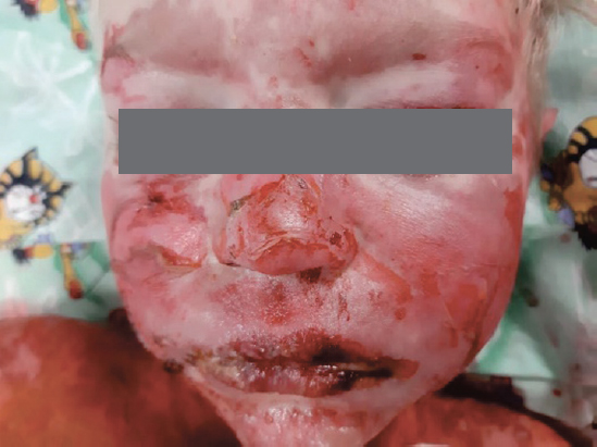 Fig. 1. Staphylococcal scalded skin syndrome, skin lesions on the face around the mouth, in the form of erythema, superficial peeling and cracks