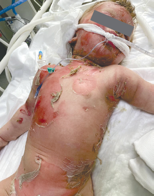 При поступлении состояние расценено как крайне тяжелое, что было связано с массивным поражением кожи (70 %) в виде обширных сливающихся эрозий, захватывающих кожу туловища и конечностей с резко выраженным симптомом Никольского. Лицо представляло собой «маску», образованную серозными корками с трещинами. Глаза не открывались, однако ребенок сосал соску. Слизистые оболочки рта и гениталий были свободны от поражений. Девочка была вялой, лихорадила (рис. 6, 7).