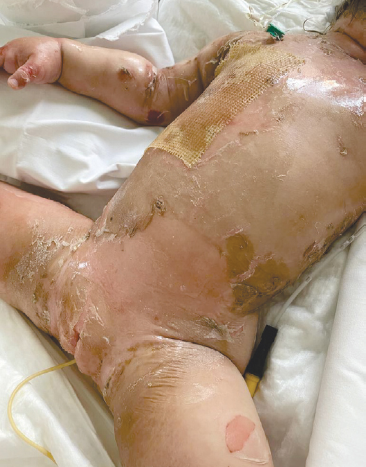 Девочка, 1 г. 1 мес., поступила в реанимационное отделение СПбГПМУ с диагнозом «синдром Лайелла» переводом из центральной районной больницы другого города, где находилась с 21 по 25 сентября 2021 г. Из анамнеза известно, ребенок от второй нормально протекавшей беременности, родилась с массой тела 2400 г, длиной 50 см. До 6 мес. находилась на грудном вскармливании. Привита по возрасту. На первом году жизни не болела. Впервые заболела 15 сентября 2021 г., когда был поставлен диагноз «острый ринофарингит», по поводу которого получала симптоматическую терапию и азитромицин в течение трех дней. Однако состояние ее не улучшалось, держалась температура, а вокруг рта, носа и на щеках появились высыпания в виде эрозий и корок, что было расценено как аллергодерматит. Были назначены антигистаминные препараты и наружная терапия (какая не известно). В дальнейшем процесс на коже продолжал распространяться, появились пузыри, захватившие область шеи, груди, началась отслойка эпидермиса. 21 сентября девочку госпитализировали в реанимационное отделение по месту жительства с диагнозом «ТЭН (синдром Лайелла)». Были назначены преднизолон в дозе 10 мг/кг, антигистаминные препараты, инфузионная терапия. Состояние ребенка прогрессивно ухудшалось, в связи с чем 25 сентября она поступила в отделение реанимации СПбГПМУ.