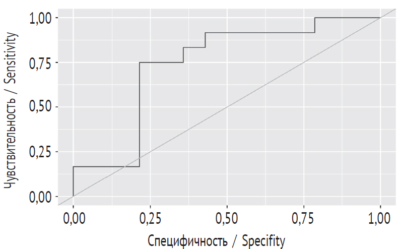 В табл. 5 стимулированные уровни тестостерона расположены в порядке убывания чувствительности и увеличения специфичности показателя. Пороговая стимулированная концентрация тестостерона в точке cut-off, которой соответствовало наивысшее значение индекса Юдена, составила 2,11 нмоль/мл. ГГ прогнозировали при значениях ниже данной величины или равном ей. Чувствительность и специфичность модели составили 75,0 и 78,6 % соответственно. Площадь под ROC-кривой (рис. 3) — 0,744 ± 0,097 с 95 % ДИ 0,553–0,935. Это свидетельствует, что установленный пороговый уровень тестостерона в ходе ФПТ1 статистически значим (p = 0,035).