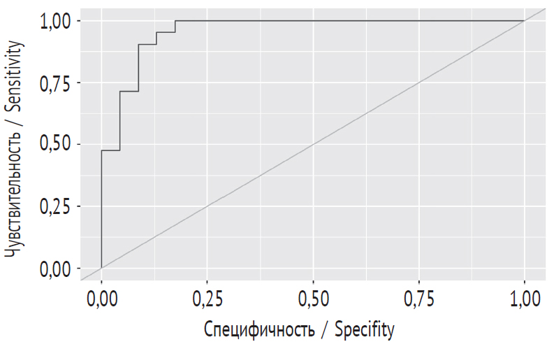 В табл. 2 стимулированные уровни ЛГ расположены в порядке убывания чувствительности и увеличения специфичности показателя. Пороговая стимулированная концентрация ЛГ в точке cut-off, которой соответствовало наивысшее значение индекса Юдена, составила 8,90 МЕ/л. ГГ прогнозировали при значениях ниже данной величины или равном ей. Чувствительность и специфичность модели составили 100,0 и 82,6 % соответственно. Площадь под ROC-кривой (рис. 1) — 0,959 ± 0,031 с 95 % доверительным интервалом (ДИ) 0,898–1,000. Это свидетельствует, что установленная пороговая точка стимулированного ЛГ статистически значима (p < 0,001).