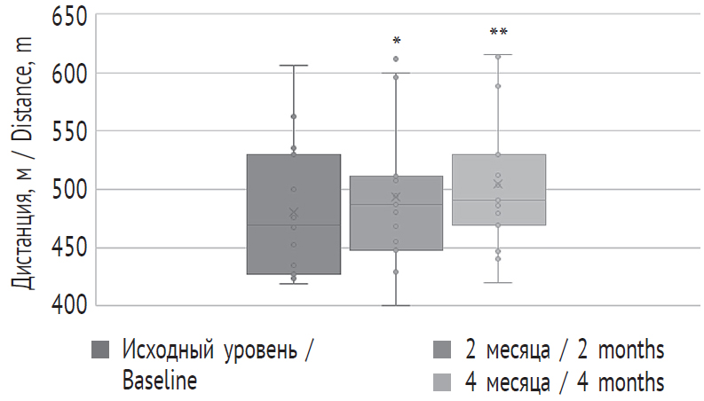 Рис. 1. Динамика дистанции 6-минутного теста ходьбы. * p < 0,05; ** p < 0,005 / Fig. 1. Dynamic of the 6 minute walking test. * p < 0.05, ** p < 0.005