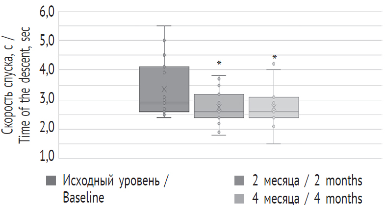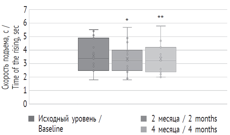 Средние значения скорости подъема с пола на исходном уровне в группе испытуемых 3,7 ± 0,2 с. При динамическом наблюдении была отмечена положительная динамика, среднее время 3,5 ± 0,2 с (p < 0,08) через 2 мес. и 3,5 ± 0,2 с (p < 0,05) — через 4 мес. (рис. 2).