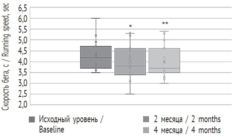 Средние значения скорости бега на дистанцию 10 м на исходном уровне в группе испытуемых составляли 4,3 ± 0,1 с. При динамическом наблюдении через 2 мес. среднее время 4,1 ± 0,2 с (p < 0,05) и через 4 мес. 4,1 ± 0,1 с (p < 0,005) (рис. 3).