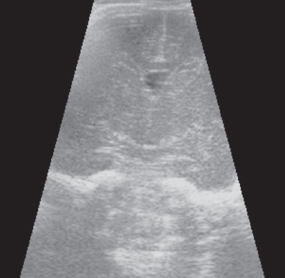Рис. 3. Краниальная сонография недоношенного ребенка 30 недель ПКВ. Фронтальный скан. Герминальный матрикс в просветах передних отделов боковых желудочков не визуализируется