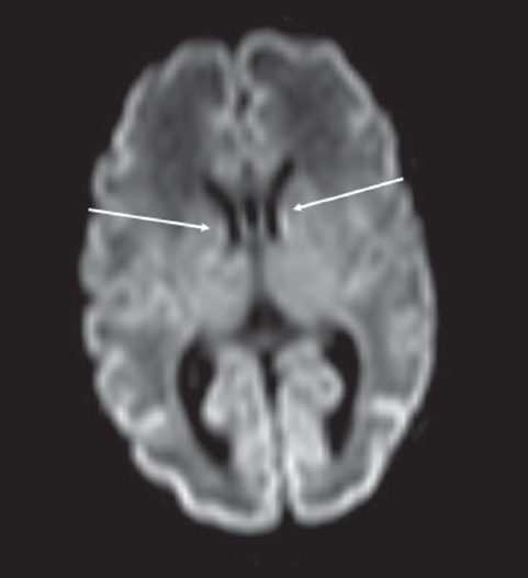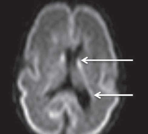 Рис. 7. МРТ головного мозга недоношенного ребенка (ПКВ 34 недели). ДВИ, аксиальная проекция, герминальный матрикс визуализируется вдоль наружных стенок боковых желудочков (отмечен стрелками)