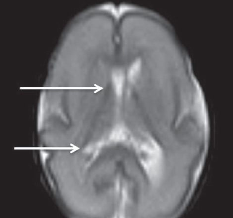 Рис. 5. МРТ головного мозга недоношенного ребенка (ПКВ 28 недель). Т2 ВИ, аксиальная проекция, стрелками выделены участки