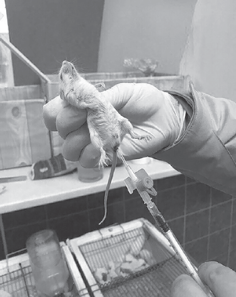 Животные были поделены на шесть групп (табл. 1). Группу контроля составило десять животных (группа 1); десять животных получали только МНМ (группа 2); 20 животных — МНМ + L-тироксин (группа 3) и 20 животных — МНМ + ПТУ (пропилтиоурацил) (группа 4). Кроме того, были сформированы еще две группы по 20 животных без применения МНМ, одна из которых получала только L-тироксин (группа 5), а другая — только ПТУ (группа 6). Таким образом, чтобы достичь гипертиреоидного состояния использовали L-тироксин в концентрации 0,01 %, а чтобы достичь гипотиреоидного состояния — ПТУ в концентрации 0,5 %. Оба вещества добавляли в поилки. Для экспозиции животных к МНМ применяли метод ректального введения, при котором с помощью гибкого пластикового зонда МНМ доставляли в прямую кишку в концентрации 0,8 % [8]. Процедуру повторяли 1 раз в неделю в течение четырех недель. Глубина введения ректального зонда составляла около 1 см (рис. 1).
