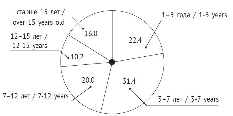 Были сформированы две группы: I группу составили дети в возрасте от 1 года до 7 лет (младшего возраста) — 411 человек (53,8 %), в среднем — 3,8 ± 0,1 года; II группу — от 7 до 17 лет (школьного возраста) — 353 человека (46,2 %), в среднем — 11,9 ± 0,2 года.