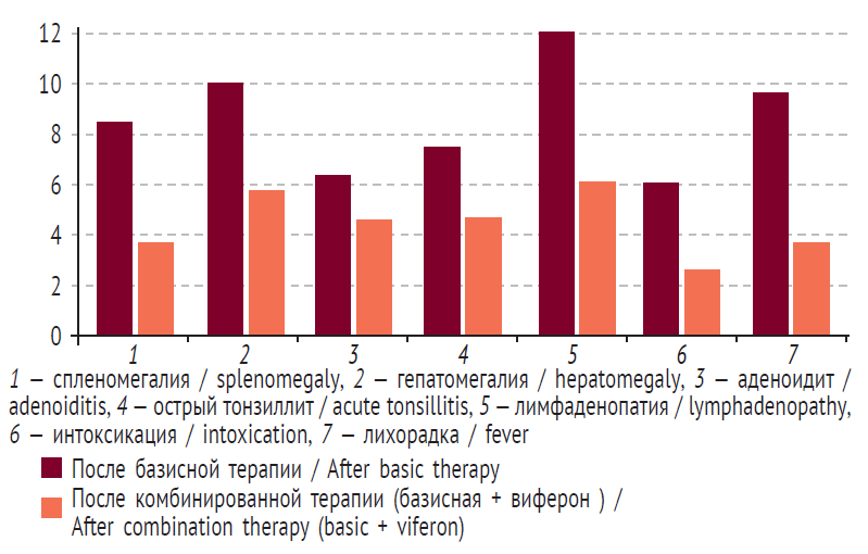 При включении в терапию виферона продолжительность всех клинических синдромов достоверно уменьшалась по сравнению с детьми, получавшими только базисную терапию. В частности, у детей младшего возраста длительность синдрома лихорадки сокращалась в 2 раза. Проявления синдрома интоксикации существенно уменьшались уже к 3–4-м суткам болезни. Продолжительность лимфопролиферативного синдрома (лимфаденопатия, острый тонзиллит, аденоидит, гепатоспленомегалия) также достоверно сокращалась в 1,5–2 раза. У детей школьного возраста, получавших виферон, отмечалась еще более быстрая выраженная положительная динамика ведущих клинических синдромов.