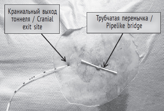 В 3-й группе пациентов катетер туннелизировали (рис. 1). Для формирования подкожного туннеля использовали периферический венозный катетер на игле (ПВК), который проводили подкожно, отступя на 3 см краниальнее места выхода эпидурального/периневрального катетера с направлением кончика иглы на 3–4 мм латеральнее выхода катетера из кожи. После удаления иглы ретроградно проводили через просвет ПВК эпидуральный/периневральный катетер до выхода его из павильона, затем ПВК удаляли. Когда над кожей оставалась небольшая петля, в нее укладывали трубчатую перемычку, предотвращающую излом катетера, и петлю затягивали (рис. 2). Место туннелизации укрывали стерильной фиксирующей наклейкой. После пункции и катетеризации эпидурального или периневрального пространства болюсно вводился местный анестетик (ропивакаин 0,2 %), дозу и объем анестетика рассчитывали индивидуально.